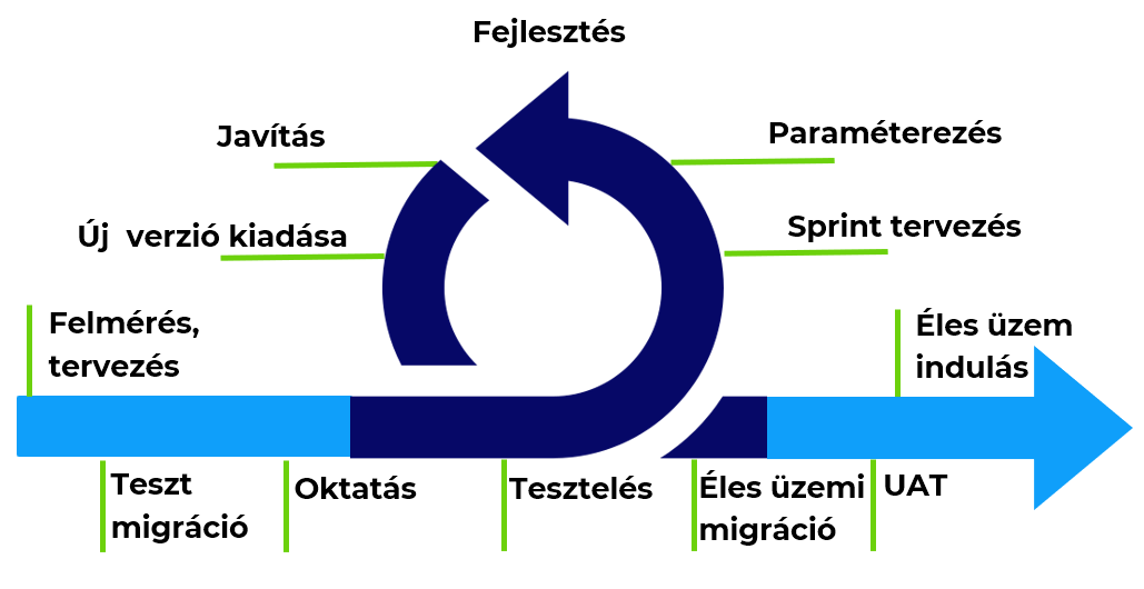 A bevezetés következő fázisában történik a rendszer telepítése és az alapszintű paraméterezése. Ezenkívül a tervezés során egyeztetett struktúrában történik az adatok átvétele, ellenőrzése és betöltése. A teszt adatmigráció során biztosítjuk, hogy az adatok megbízhatóan és pontosan kerüljenek átvitelre, előkészítve a rendszer tesztelésére és működésének optimalizálására.