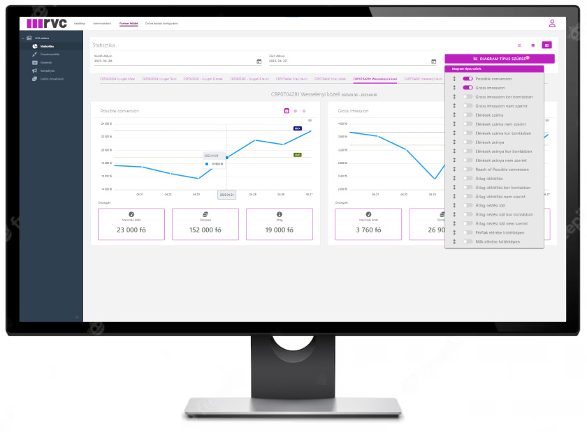 Az RVC adatmonitoraink lehetővé teszik az ügyfeleink számára a városi reklámok helyszínenként, kampányonként történő folyamatos monitorozását és optimalizálását. A felhasználóbarát felület a media monitoringhoz szükséges mutatót és grafikont könnyen lekérdezhetővé teszi.